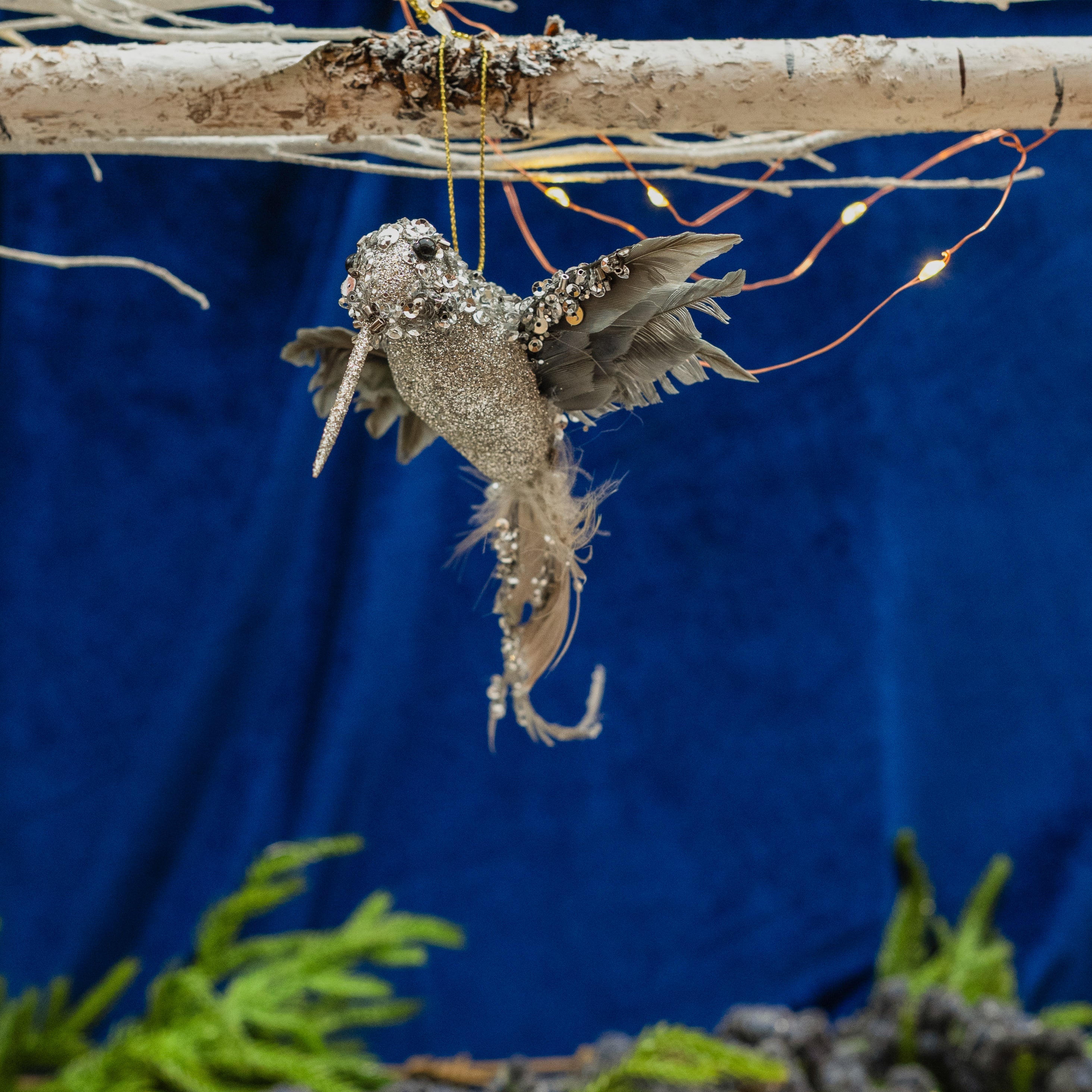 Designed to impress, this glittering bird ornament with flowing feathered tail and sparkling embellishments brings a luxurious charm to any holiday setting.