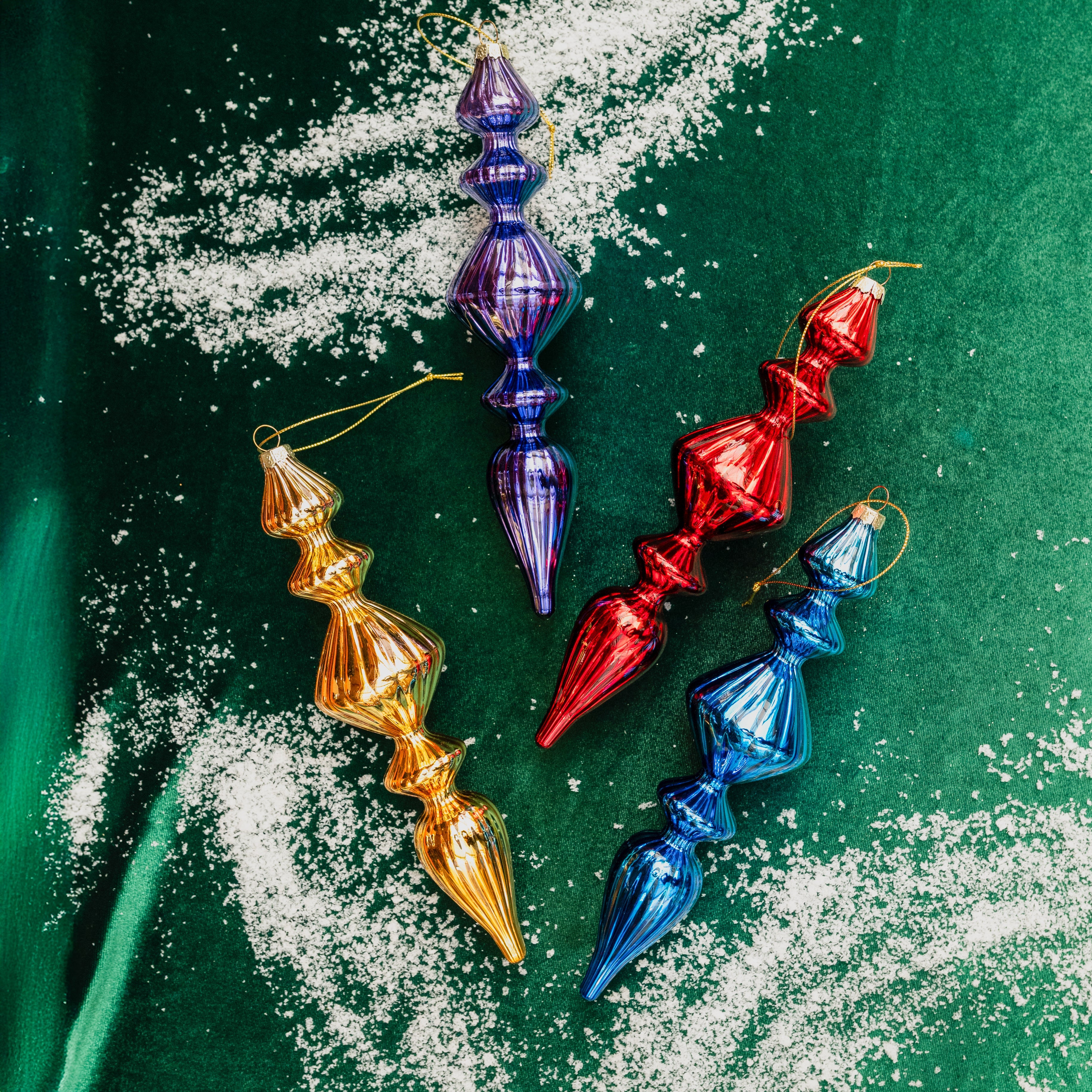Add a bold, festive touch to your tree with this set of glass geometric finial ornaments. Featuring striking shapes in gold, purple, red, and blue, they bring vibrant color and modern elegance to your holiday décor.