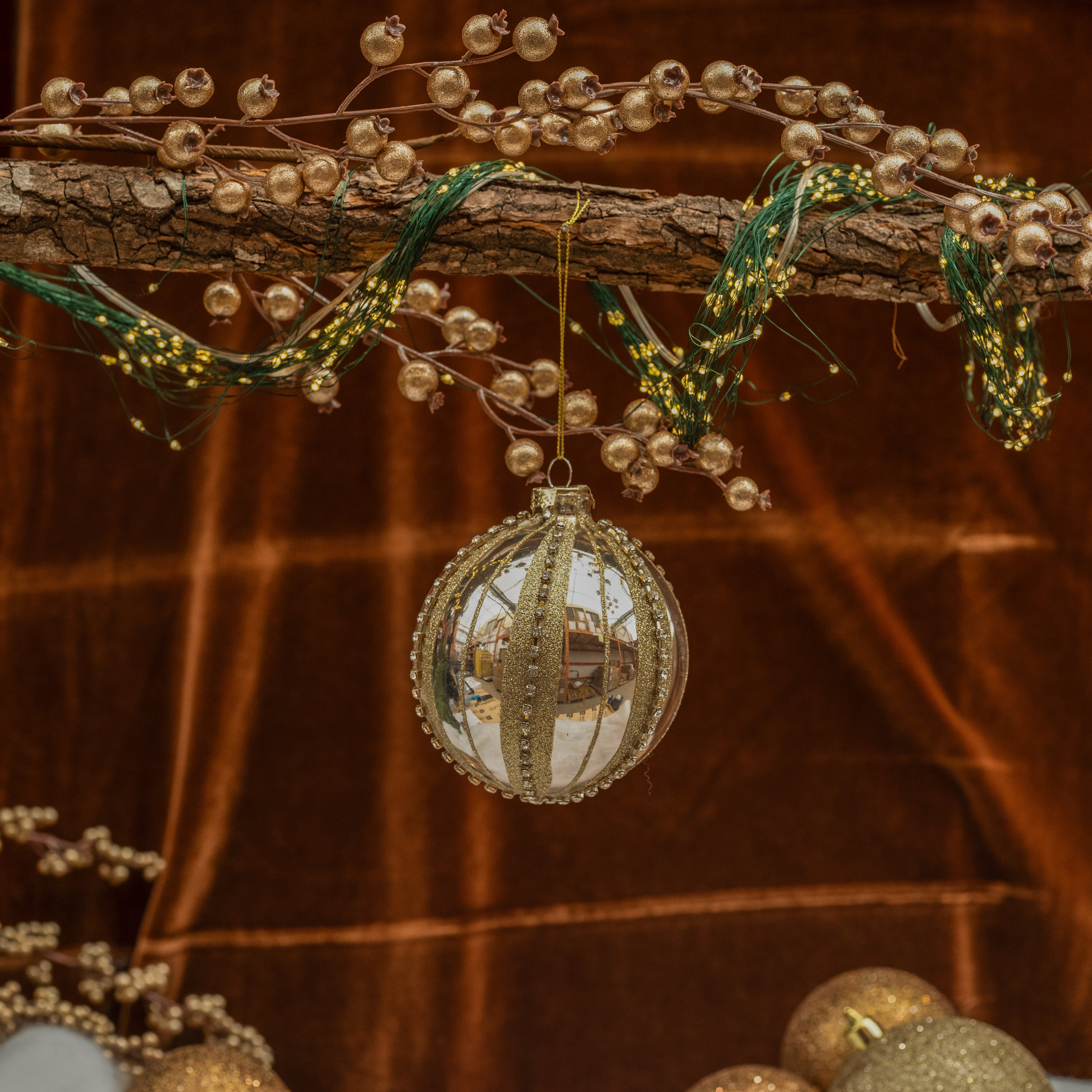 Add a touch of luxury to your Christmas tree with this stunning Champagne bauble. Featuring alternating metallic panels framed with sparkling bead accents, it catches the light beautifully and brings timeless elegance to your holiday décor.