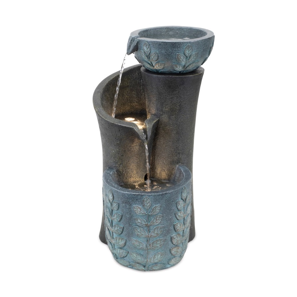 Enhance your outdoor sanctuary with the calming beauty of this Two‑Tier Leaf Relief Outdoor Fountain, designed with a rustic stone‑look finish and soft, warm LED illumination. Featuring embossed leaf motifs and an organic sculptural shape, this fountain blends natural inspiration with artistic charm. Water flows smoothly from the upper leaf‑patterned bowl into the central basin, then cascades gently into the lower reservoir. The built‑in LED lights create a peaceful glow that highlights the flowing water at night, making it a perfect centerpiece for patios, decks, or garden corners. 19.5" h