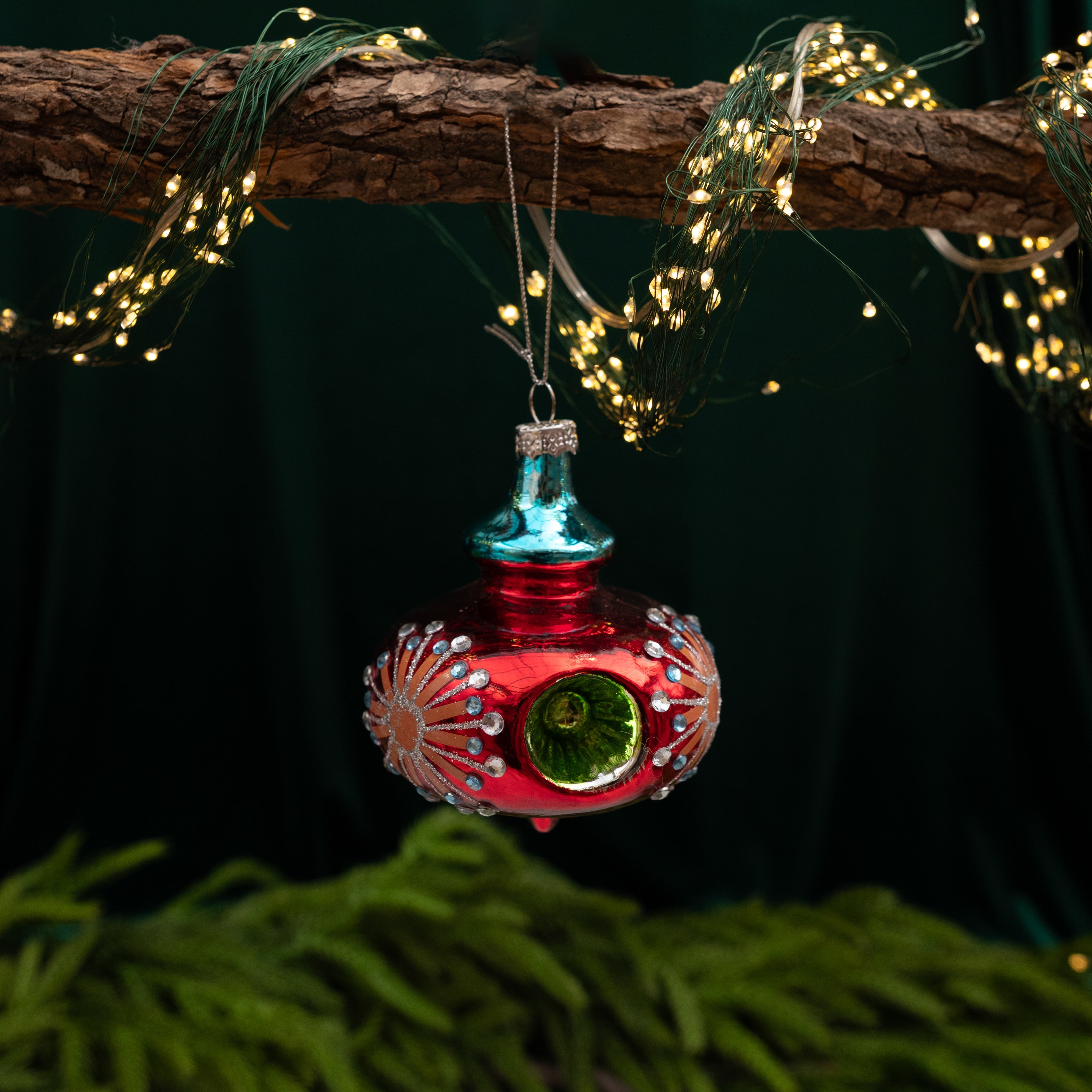 Bring vintage charm to your holiday décor with this dazzling red and blue glass ornament. Adorned with intricate starburst detailing and gem-like accents, it captures the magic of mid-century design while adding a festive sparkle to your tree.