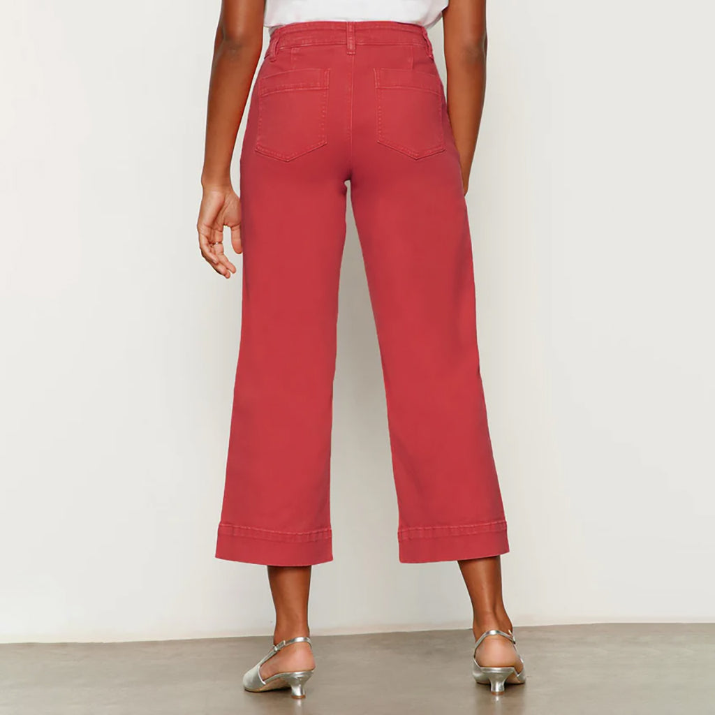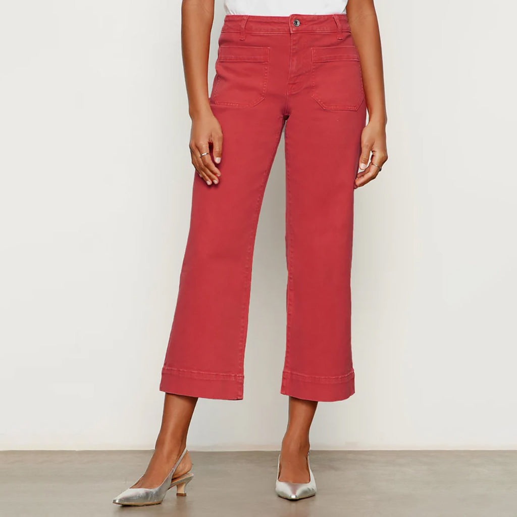 Refresh your everyday wardrobe with these modern cropped wide‑leg pants, designed for effortless style and all‑day comfort. Crafted in a rich, warm red hue, they feature a high‑rise waist that flatters the silhouette and adds a touch of structure. Front patch pockets lend a casual, contemporary vibe while offering functional storage. 27" inseam 98% Cotton, 2% Spandex.