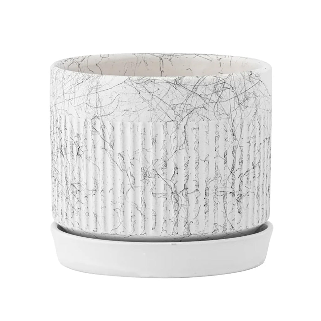 Ribbed Marble ceramic pot has delicate marbling with a saucer