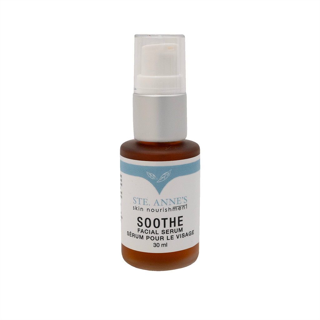 Soothe Facial Serum is designed for red and inflamed skin conditions. The botanicals we chose to work with all have an action against inflammation. Inflammation stresses the skin causing long term damage and premature aging of the skin. This product is designed to help diffuse redness in the short term and address the underlying inflammatory reaction in the long term.